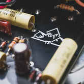 1960年代後半にファズを愛するすべてのギタリストが通るペダル(偏見です) "Big Muff" が誕生しました。生産時期によってさまざまなバリエーションがあり、やはり初期のTriangleと呼ばれる個体は特別な存在感を放っています。その中でも更に最初期と言われているTriangle V1 Firstは、Parfboard(蛇の目基板)を使用しパーツとパーツを直接つなげる"Point To Point"で作られており、とても不安定で芸術的です。サウンドは時代背景もあってか、数多くあるバリエーションの中でも最もファズらしい荒々しさを持ち、図太さの中にもナイフのような鋭い高音を感じます。これは明らかにtriangleより後のバリエーションにはない特徴です。